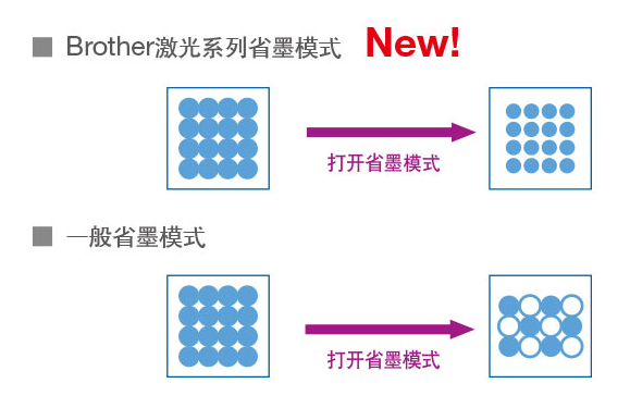 Brother支持省墨模式,通過縮小墨點(diǎn)的大小來達(dá)到省墨的效果,而不是通過減少墨點(diǎn),這樣即使使用省墨模式,也能保證打印效果。