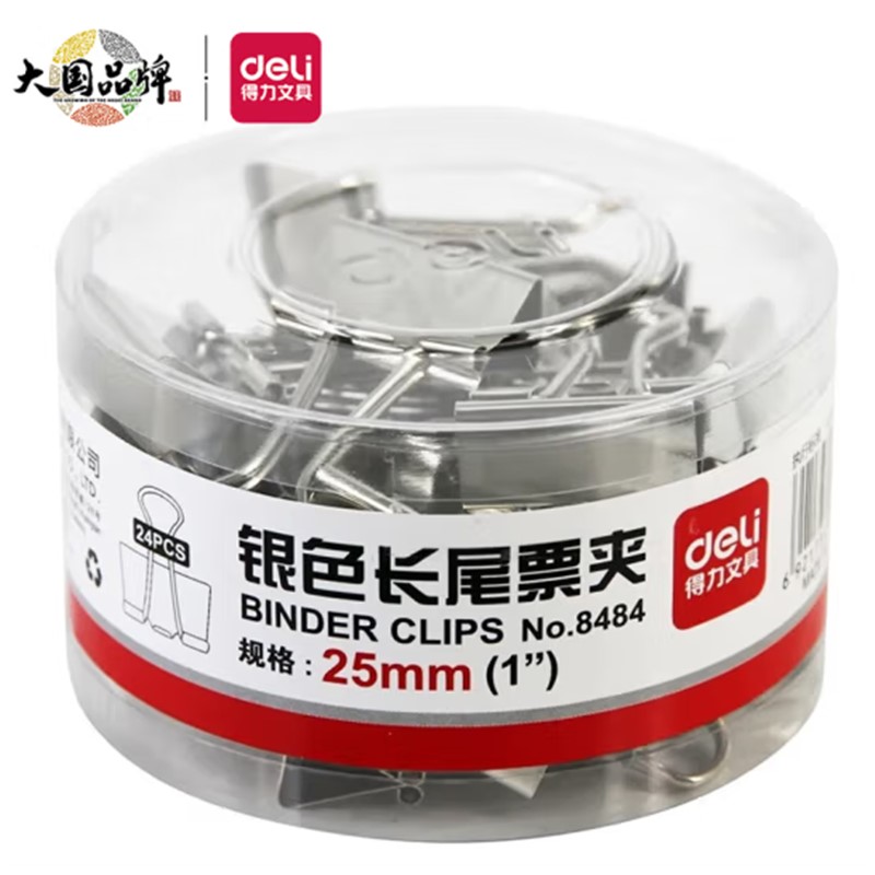 得力(deli) 8553ES展架/板夾/書立/筆筒及配件類 25mm中號銀色長尾夾/票夾/燕尾夾/文件夾子 24只/桶