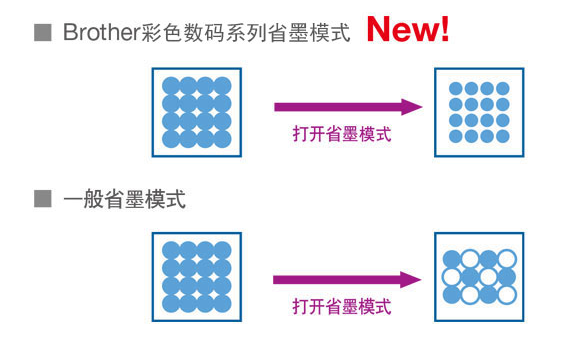 選擇Brother省墨模式可以節(jié)省墨粉消耗。兄弟彩色數(shù)碼系列省墨模式是通過縮小墨點空間來完成的,墨點的數(shù)量沒有改變,即使使用了省墨模式也不會影響打印質(zhì)量。