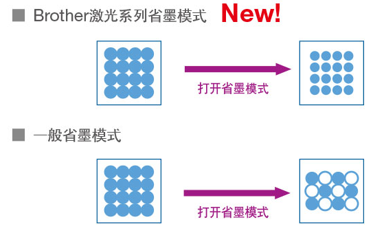 Brother支持省墨模式,通過縮小墨點的大小來達到省墨的效果,而不是通過減少墨點,這樣即使使用省墨模式,也能保證打印效果。