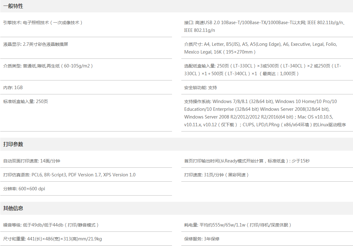 也可選配1個250頁的大容量紙盒(LT-330CL)和1個500頁超大容量紙盒 (LT-340CL),最大紙張容量:750頁